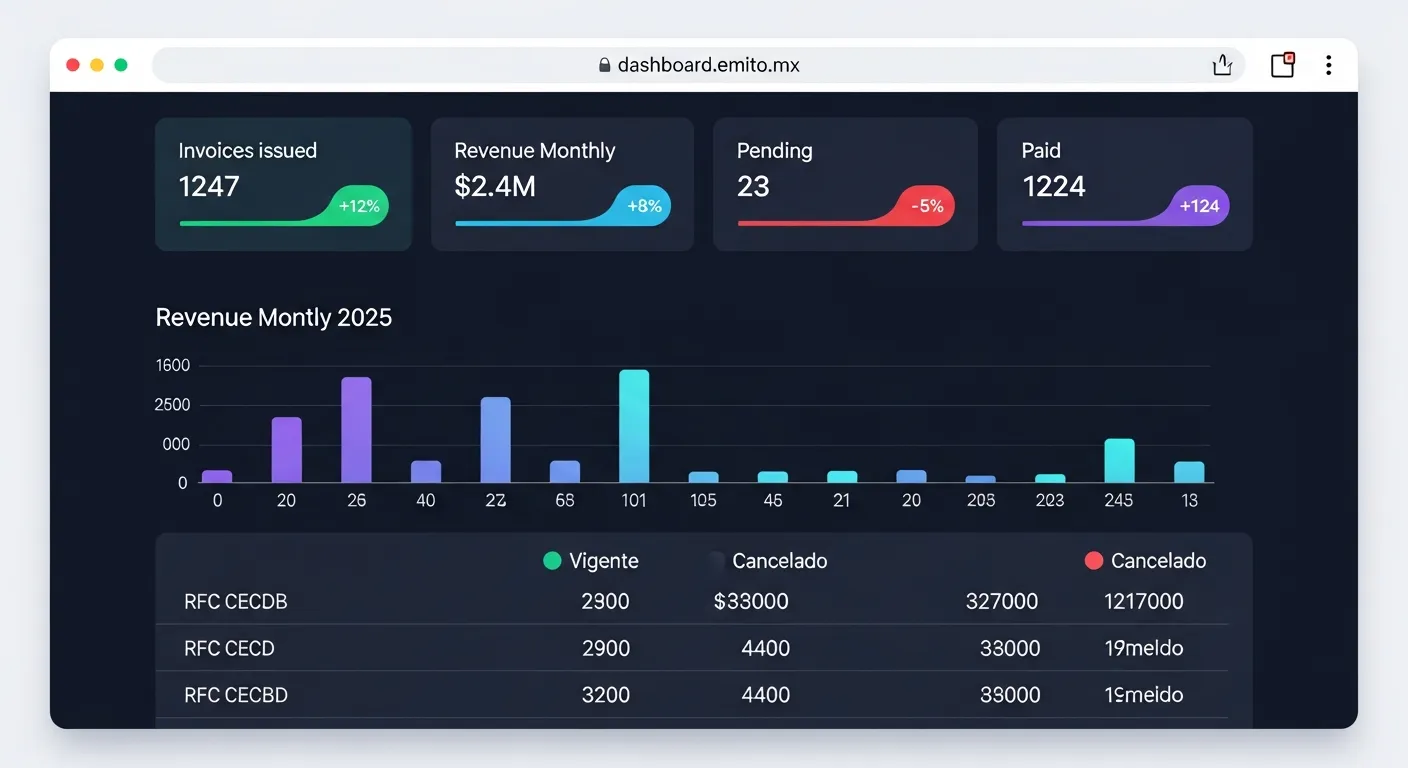 Dashboards en tiempo real con el estado de tus facturas, pagos pendientes y conciliación automática con el SAT.