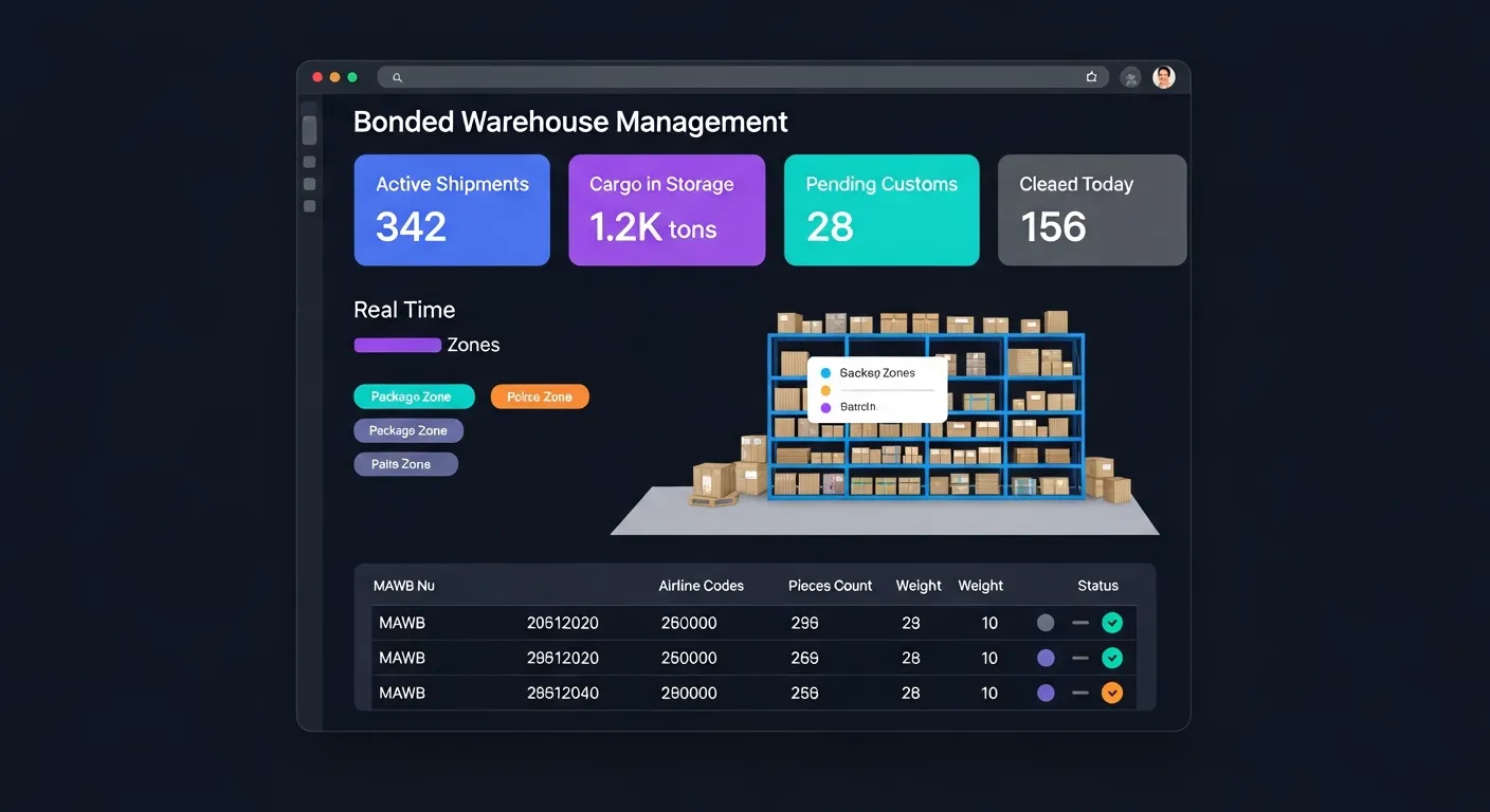 Gestión completa del ciclo de carga aérea desde el arribo hasta la entrega. Control de Master y House Air Waybills con trazabilidad pieza por pieza.